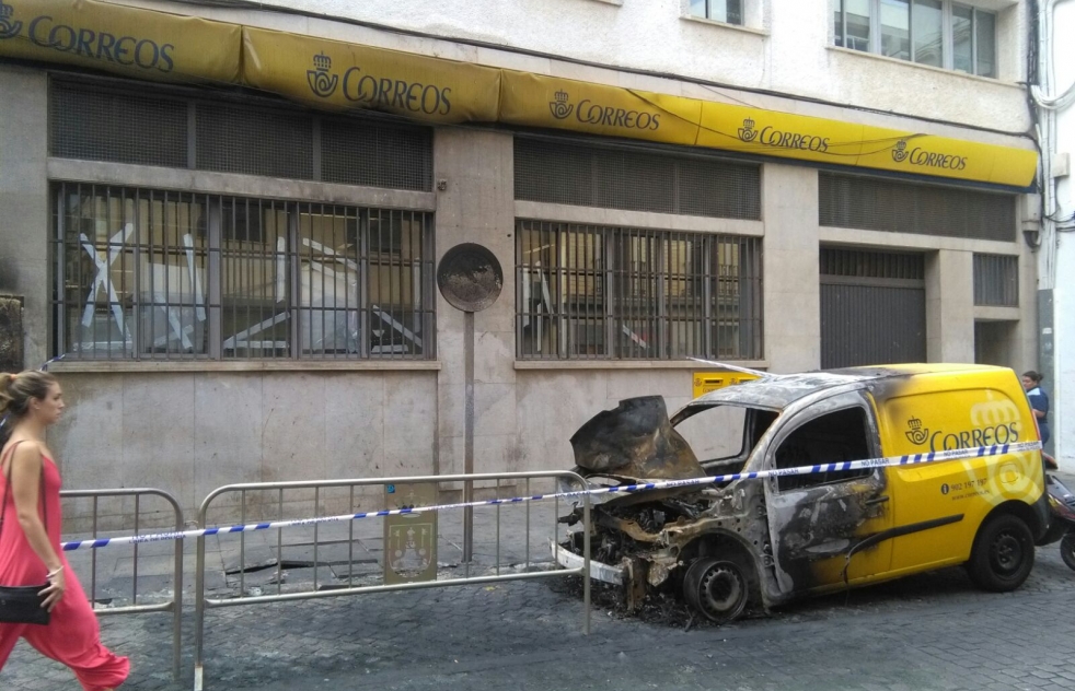 El incendio ha causado daños en la fachada del edificio de Correos, donde han llegado a romperse cristales y han ardido elementos de rotulación. La oficina está cerrada para arreglar los desperfectos y los envíos pueden realizarse en la oficina de la calle Silos, 92.